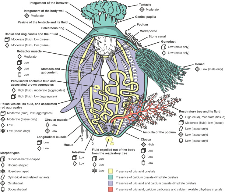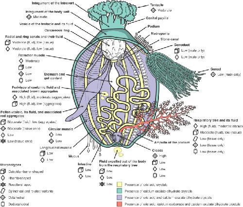Diversity and distribution of extracellular microcrystals in holothuroid echinoderms.