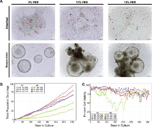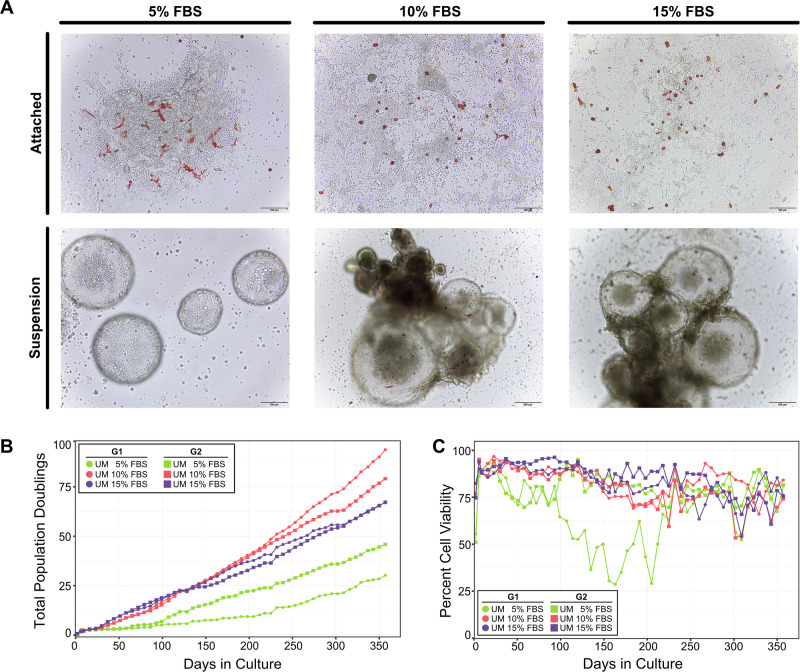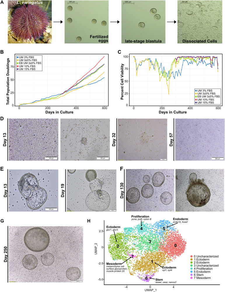 Fig. 8. Cell cultures derived from mechanical dissociation of S. purpuratus gastrula-stage embryos.A Representative images of gastrula-derived embryonic cells cultured in Urchin Media (UM) with different concentrations of FBS (5%, 10% or 15%) at Day 110 in culture. All cultures contained a mixture of adhered colonies (A, Attached), as well as single cells in suspension and spheroids/embryoid bodies (A, Suspension). Scale bars are 100 µm for all Attached images and Suspension image in 5% FBS or 200 µm for Suspension images in 10% and 15% FBS. B Cumulative population doublings for cells grown in UM with different concentrations of FBS over the first 357 days in culture. Each line on the graph represents a culture maintained as an independent replicate (G1 or G2) for each media condition. C Cell viability over the first 357 days in culture in UM with different concentrations of FBS. All cell counts and viability data are shown in Supplementary Data 12. |
