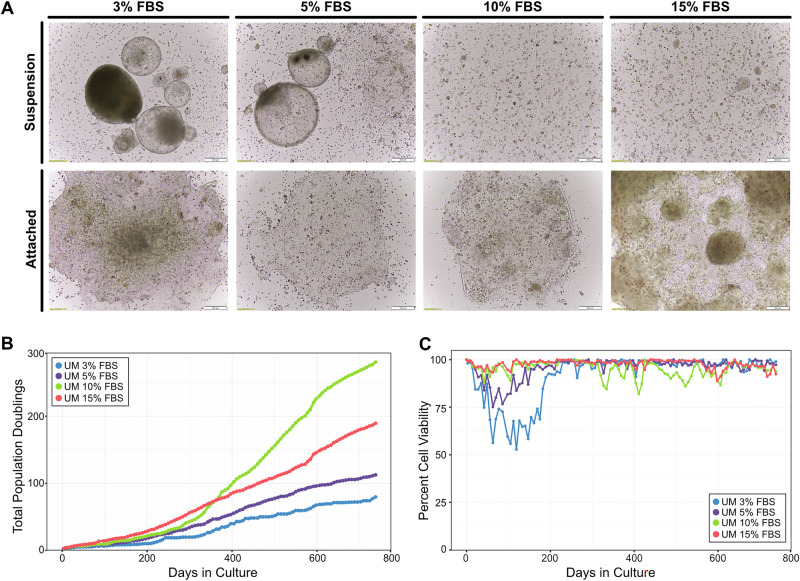 Fig. 2. L. variegatus embryonic cell cultures generated from the second mating pair.Late-stage blastulae were mechanically disrupted and seeded directly in Urchin Media (UM) with different concentrations of FBS. All cultures contained a mixture of single cells in suspension and cell aggregates (A, Suspension), and adhered colonies (A, Attached). Embryoid bodies and spheroids were more prevalent in cultures with lower concentrations of FBS (3−5%). Scale bar represents 200 µm. B Cumulative population doublings for cells grown in UM with different concentrations of FBS over the first 2 years in culture. Each line on the graph represents a culture maintained as an independent replicate. C Cell viability over the first 2 years in culture in UM with different concentrations of FBS. Three replicate cultures were initiated for all conditions, but only one replicate from each condition was kept for long-term observations. Cell counts and viability data for all replicates are shown in Supplementary Data 4. |