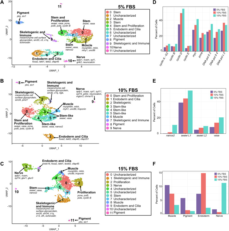 Fig. 3. Single-cell RNA-seq on cultured L. variegatus embryonic cells on Day 169 in culture.A−C UMAP plots showing clusters of cells that were assigned identities based on the expression of selected marker genes for cells cultured in UM with 5% FBS (A), UM with 10% FBS (B) and UM with 15% FBS (C). Select marker genes for each assigned cluster are indicated, and a complete list of marker genes is shown in Supplementary Data 6. Uncharacterized clusters could not be definitively identified based on marker gene expression. D, E Percent of cells expressing selected cell proliferation markers (D) and stem cell markers (E) when cultured in UM with different concentrations of FBS (5%, 10% or 15%). F Percent of cells expressing markers for muscle, pigment, nerve and endodermal cells when cultured in UM with different concentrations of FBS (5%, 10% or 15%). |