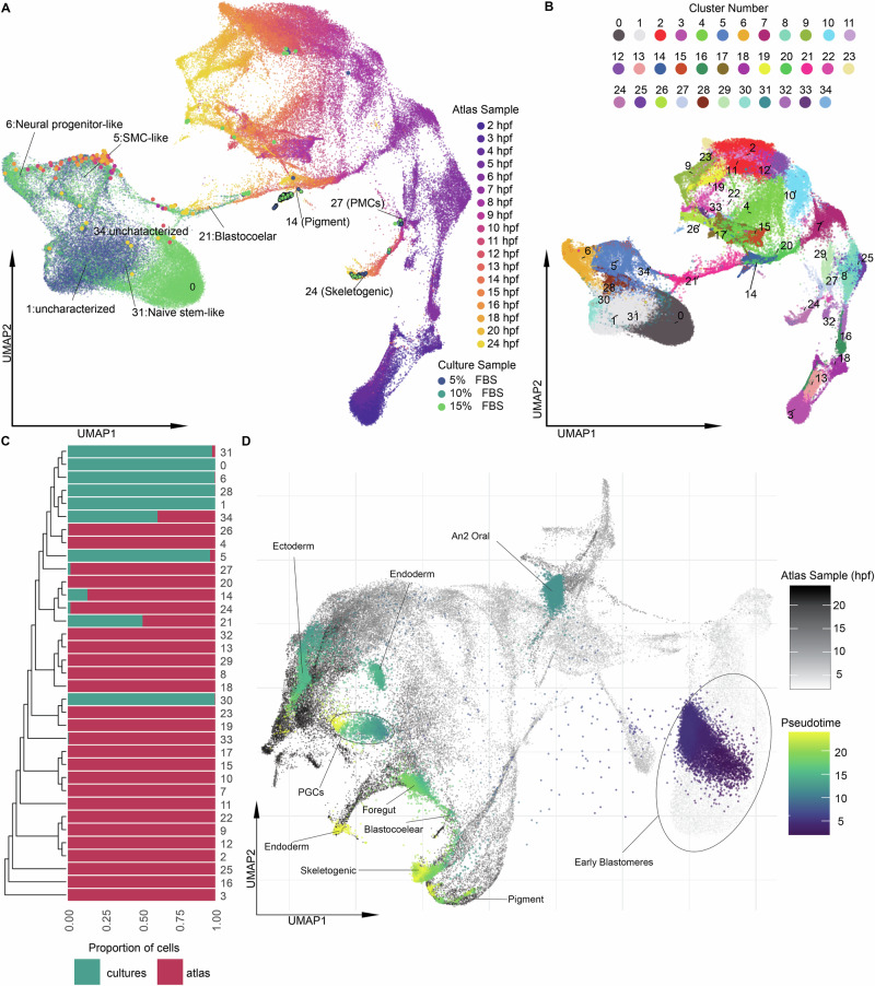 Fig. 4. Integrated scRNA-seq analysis of cell cultures at Day 169 and the L. variegatus atlas of development.A Integrated UMAP of cultured cells and developmental atlas colored by sample with hours post fertilization (hpf) for the atlas, and culture conditions for the cells (Urchin Media with 5%, 10%, or 15% FBS). Cultured cells are represented in greens and blues while atlas cells are in oranges and purples. Cultured cells occupying neighborhoods that are predominantly composed of atlas cells are emphasized by increased point size, and vice versa. Shared clusters are indicated with labels and corresponding cluster number. Clusters were considered shared if there were at least five cells from both the atlas and the cultures overlapping in UMAP space. B Cell-type cluster locations in integrated UMAP space. The full list of cluster identities is shown in Supplementary Data 7. C Cladogram showing hierarchical clustering of cell-types by similarity, rooted in cluster 3 which corresponds to totipotent 2- and 4-cell blastomeres, and the proportion of cells in each cluster originating from cultures (green) or atlas (red). D Pseudotime analysis conducted by mapping cultured cells to the unintegrated atlas manifold and taking the distance weighted average of the developmental time of the most proximal atlas cells (hours post-fertilization, hpf). Developmental atlas and cell culture pseudotime in integrated analysis UMAP space is shown in Supplementary Fig. 9. |