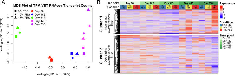 Fig. 5. Transcriptional changes in the L. variegatus embryonic cell cultures assessed by bulk RNA sequencing throughout the first 2 years of culture.A Multi-dimensional scaling (MDS) analysis demonstrated that cells maintained in 5%, 10%, and 15% FBS became dissimilar over time in culture (Day 20, 182, 313, 445, and 738). Input values were pOverA, VST-transformed TPM counts. B Heatmap showing changes in gene expression patterns over time for cultures maintained in UM with 5% FBS, UM with 10% FBS, and UM with 15% FBS. Clusters are based on k-means clustering with Cluster 1 showing increased expression and Cluster 2 showing decreased expression over time in culture. Expression values are VST-transformed, rowmean-centered TPM counts. Data used to generate this figure is shown in Supplementary Data 8. |