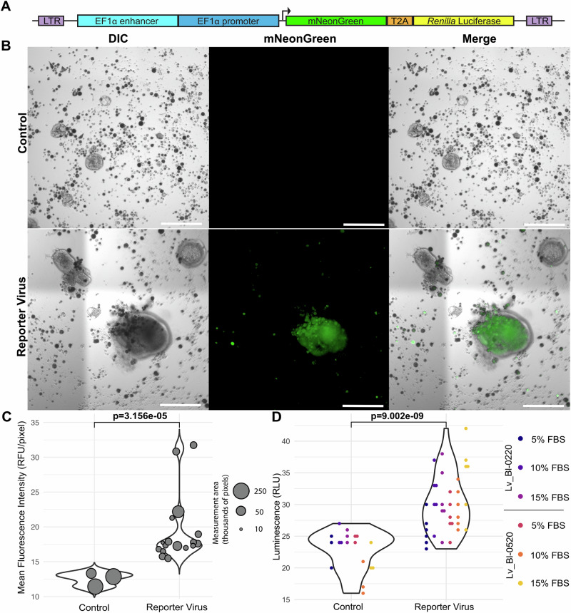 Fig. 6. Lentiviral transduction of cultured L. variegatus embryonic cells.A Lentiviral transfer plasmid map. EF1α promoter and enhancer sequences are from the L. variegatus genome. mNeonGreen is codon optimized for L. variegatus. B Representative composite fluorescence micrographs of live cells transduced with reporter virus. Heat-killed virus is used as a control. Scale bars are 200 μm. C Quantification of mean fluorescent signal intensity from transduced cells. Dot sizes represent the area of integration for each measurement. Control condition is heat-killed virus. D Luciferase assay of transduced cells. Each color represents a distinct culture, and each point represents a unique transduction. Control condition is heat-killed virus. Additional fluorescence micrographs of L. variegatus embryonic cell cultures transduced with reporter lentivirus are shown in Supplementary Fig. 12 and the data used to generate the plots in (C, D) are shown in Supplementary Data 10. |