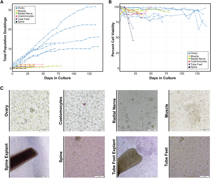 Fig. 7. L. variegatus adult tissue cell cultures.Cell proliferation (A) and viability (B) for cells isolated from ovary (n = 7), Aristotle’s lantern muscle (n = 4), coelomocytes (n = 3), radial nerve (n = 2), tube feet (n = 1), and spines (n = 1). Each line on the graph represents a culture maintained as an independent replicate and all cell counts and viability data are shown in Supplementary Data 11. C Representative images from adult cell cultures derived from coelomocytes, and collagenase digested tissues for ovary, radial nerve, Aristotle’s lantern muscle, spines and tube feet, as well as explants from a spine and tube foot. Scale bars are 50 µm for all images except nerve (100 µm), and explants of spine and tube foot (200 µm). |