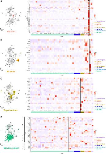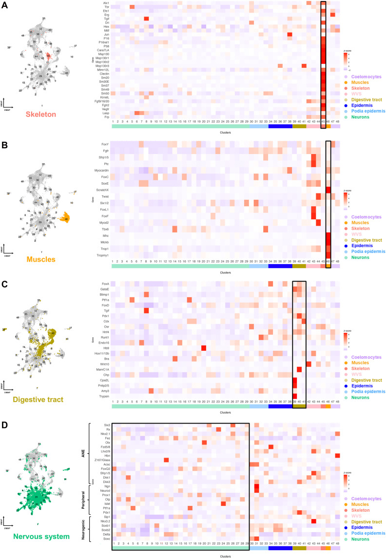 Fig. 2. Regulatory signatures of the P. lividus 2 wpm juvenile cell types.(A) UMAP highlighting the skeletal cluster in the P. lividus snRNA-seq data and heatmap showing the z-score, in the P. lividus snRNA-seq atlas, of genes constituting the S. purpuratus larval skeletogenic GRN. (B) UMAP highlighting the muscle cluster in the P. lividus juvenile snRNA-seq data and heatmap showing the z-score, in the P. lividus juvenile snRNA-seq atlas, of gene markers that are part of the S. purpuratus larval myogenesis GRN. (C) UMAP highlighting the digestive tract clusters in the P. lividus juvenile snRNA-seq data and heatmap showing the z-score, in the P. lividus snRNA-seq atlas, of genes patterning different domains of the S. purpuratus larval gut. (D) UMAP highlighting the neuronal clusters in the P. lividus juvenile snRNA-seq data and heatmap showing the z-score, in the P. lividus snRNA-seq atlas, of genes expressed in the sea urchin embryonic ANE and embryonic and larval peripheral neurons or necessary for embryonic neurogenesis. |