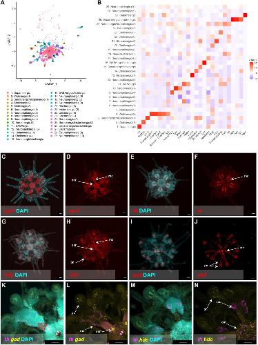 Fig. 5. Molecular characterization of the P. lividus 2 wpm juvenile nervous system.(A) UMAP highlighting the neuronal clusters and their identities in the P. lividus juvenile snRNA-seq data. (B) Heatmap showing the z-score of neuropeptides and neurotransmitters across the P. lividus juvenile neuronal clusters. HCR for syt1 (C and D), th (E and F), hdc (G and H), and gad (I and J) with (C, E, G, and I) or without (D, F, H, and J) nuclei staining (DAPI). (K and L) Double HCRs for th (magenta) and gad (yellow) and with (K) or without (L) nuclei staining (DAPI). (M and N) Double HCRs for th (magenta) and hdc (yellow) and with (M) or without (N) nuclei staining (DAPI). Juveniles are whole-mount and in oral view. Scale bars, 50 μm. |