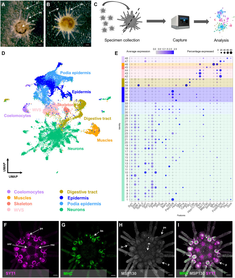 Fig. 1. Cell type diversity of the P. lividus 2 wpm juvenile.(A) Two wpm P. lividus juvenile seen from the oral side. (B) Two wpm P. lividus juvenile seen from the aboral side. (C) Schematic representation of our snRNA-seq pipeline: from intact juveniles to single-nuclei, sequencing, and computational analysis. (D) Integrated UMAP of the three snRNA-seq libraries. Cells are color-coded in respect to the cell type groups recognized. (E) Dotplot showing the percentage of nuclei and the average expression of genes used to assign cluster identities. Color code is the same as in (D). (F) IHC for myosin heavy chain (MHC), labeling muscles. (G) IHC for synaptotagmin-B (SYT1), labeling neurons. (H) IHC for MSP130, labeling skeleton. (I) Overlay of MHC, SYT1, and MSP130. Juveniles are in oral view. bs, base of the spine; m, mouth; onr, oral nerve ring; p, podia; pn, podia neurons; js, juvenile spine; ps, primary spine; rnc, radial nerve cord. Scale bars, 50 μm. |