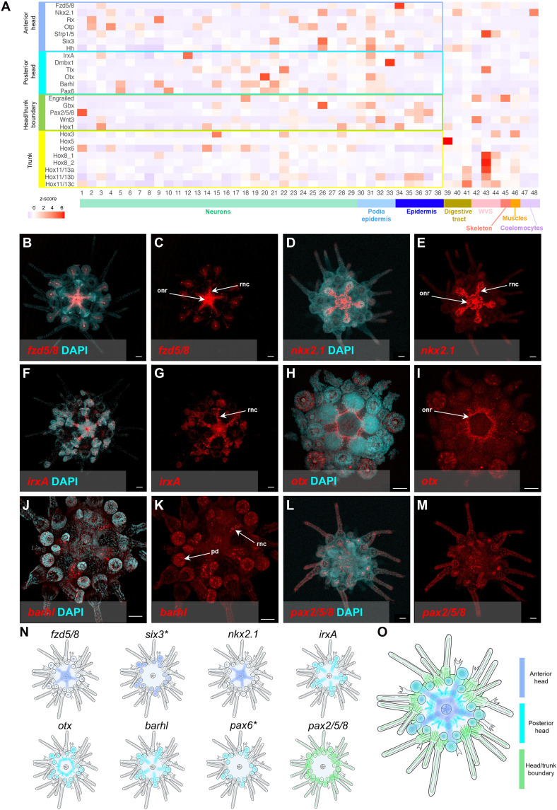 Fig. 3. Localization and balance of the head versus trunk genes in the P. lividus 2 wpm juvenile.(A) Heatmap showing the z-score, in the P. lividus snRNA-seq atlas, of genes involved in the establishment of the anterior-posterior body plan axis. (B and C) HCR for fzd5/8 with (B) and without (C) nuclei labeling [4′,6-diamidino-2-phenylindole (DAPI)]. (D and E) HCR for nkx2.1 with (D) and without (E) nuclei labeling (DAPI). HCR for irxA with (F) and without (G) nuclei labeling (DAPI). HCR for otx with (H) and without (I) nuclei labeling (DAPI). HCR for barhl with (J) and without (K) nuclei labeling (DAPI). HCR for pax2/5/8 with (L) and without (M) nuclei labeling (DAPI). pd, podia disk. Scale bars, 50 μm. (N) Schematic representation of the expression patterns of the head and trunk genes in P. lividus juveniles. Asterisks indicate previously published expression patterns of related genes in P. lividus juveniles (35). (O) Cartoon summarizing the spatial distribution of anterior head, posterior head, and head/trunk boundary genes in sea urchin. |