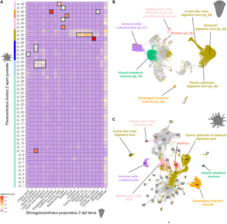 Fig. 4. SAMap cell clusters alignment scores between P. lividus juvenile and S. purpuratus 3 dpf larva.(A) Mapping of the cell clusters between the snRNA-seq P. lividus juvenile dataset and the scRNA-seq S. purpuratus larva dataset. Black boxes indicate high alignment scores. Color code for the P. lividus juvenile clusters is the same as in Fig. 1E. (B) S. purpuratus 3 dpf UMAP atlas projecting the high-scored P. lividus juvenile cell types. (C) P. lividus 2 wpm UMAP atlas highlighting the high-scored S. purpuratus larval cell types. |