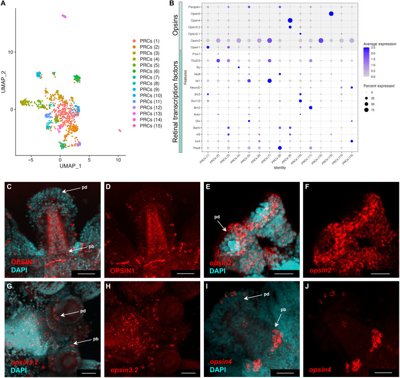 Fig. 6. P. lividus 2 wpm juvenile neuronal photoreceptor repertoire.(A) UMAP showing the subclustered and reanalyzed opsin-positive neuronal clusters. (B) Dotplot showing the percentage of nuclei and the average expression of the opsin genes encoded in the P. lividus genome and of transcription factor orthologs involved in the establishment of the PRC fate in other animals. (C and D) IHC using a sea urchin specific opsin1 antibody. (E and F) Fluorescent in situ hybridization using an antisense RNA probe against opsin2. Nuclei are stained with DAPI (cyan). HCR using a specific probe against opsin3.2 (G and H) and opsin4 (I and J). Nuclei are stained with DAPI (cyan). pb, podia base; pd, podia disc. Scale bars, 25 μm. |