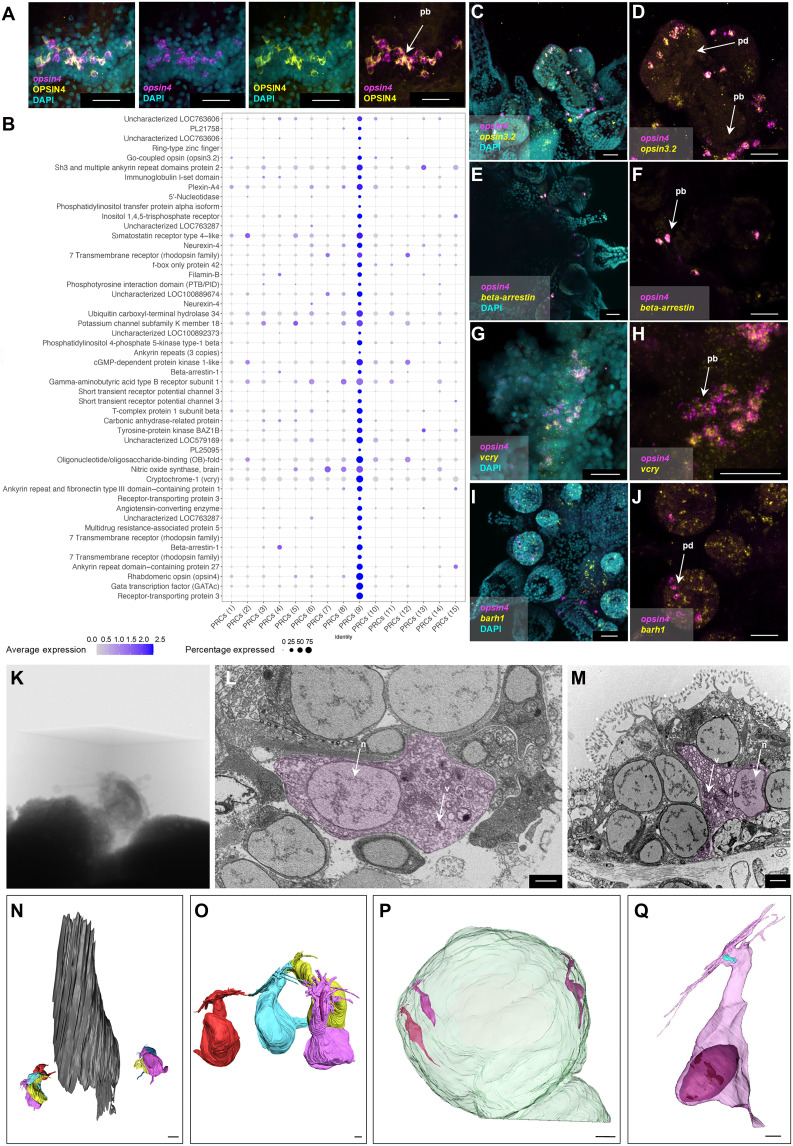 Fig. 7. Molecular and morphological reconstruction of the P. lividus 2 wpm juvenile opsin4 (melanopsin) cell type.(A) HCR for opsin4 (magenta) paired with IHC using a sea urchin specific OPSIN4 antibody (yellow). Nuclei are stained with DAPI (cyan). (B) Dotplot showing the percentage of nuclei and the average expression of the top 50 marker genes of the PRC (9) cell cluster. cGMP, cyclic guanosine 3′,5′-monophosphate. Double HCR using a specific probe against opsin4 paired with opsin3.2 (C and D), arrestin (E and F), vcry (G and H), and barhl (I and J). Nuclei are stained with DAPI (cyan). (K) Overview of one of the embedded 2 wpm P. lividus specimens before being processed for SBF-SEM. (L) SBF-SEM isolated section showing the opsin4-positive PRCs at the base of the podia. (M) TEM isolated slice showing the opsin4-positive PRCs at the podia disc. (N) 3D reconstruction of the opsin4-positive PRCs at the base of the podium. Podium 3D segmented membranes depicted in gray. (O) Close-up of the 3D reconstructed basal PRCs. (P) 3D reconstruction of the podium disc PRCs. Disc 3D segmented membranes are in pale green. (Q) Close-up of a 3D reconstructed disc PRC. Ciliary rootlet is labeled in pale blue. n, nucleus; v, vesicle. Scale bars, 25 μm (A and C to J), 4 μm (N), and 1 μm (L, M, and O to Q). |