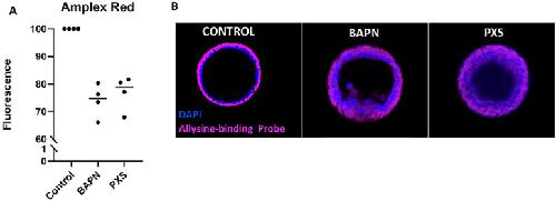 Fig. 3. BAPN and PXS reduced LOX activity and collagen crosslinking in sea urchin embryos. (A) The Amplex Red assay quantifies the fluorescence created by hydrogen peroxide, which is a byproduct of the LOX reaction. Amplex Red reagent was added to gastrula-stage embryos, and a microplate reader analyzed fluorescence after 30 min. There is a 25% and 20% decrease between the LOX-inhibited samples, BAPN and PXS at 500 µM, respectively, and the controls. This shows that in LOX-inhibited samples, the hydrogen peroxide released is reduced. (B) Allysine-binding chemical probe (pink; DNA in blue) illuminates areas of active collagen deposition and cross-linking. Control embryos display a strong and dense fluorescent signal from the chemical probe around the apical layer of the embryo. Reduced fluorescence is observed in LOX-inhibited embryos indicating reduced collagen cross-linking. Embryos are approximatively 100 μm in diameter.
