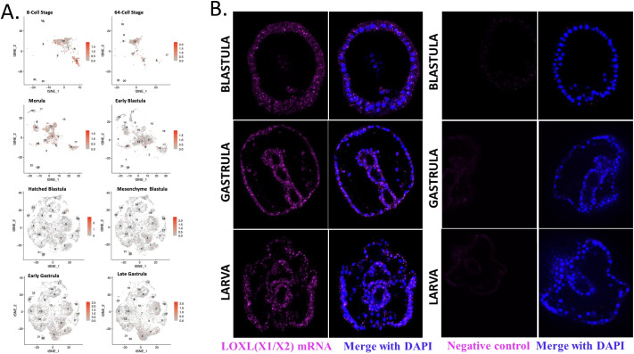 Fig. 2. LOXL(X1/X2) expression in early developmental stages. (A) Single-cell RNA-sequencing analysis shows the expression of LOXL(X1/X2) throughout early sea urchin development, with red dots representing individual cells expressing LOXL(X1/X2) mRNA. The beginning of development shows strong expression. This expression decreases over development time. (B) LOXL(X1/X2) RNA in situ hybridization. Primers were designed against the LOXL(X1/X2) sequence representing the most strongly expressed LOX according to Echinobase and single-cell RNA-sequencing data (Telmer et al., 2024; Foster et al., 2021). The expression of LOXL(X1/X2) is not specific to one region of the embryo and is expressed throughout multiple developmental timepoints. LOXL(X1/X2) in situ RNA hybridization in pink, DNA in blue. Embryos are approximatively 100 μm in diameter.