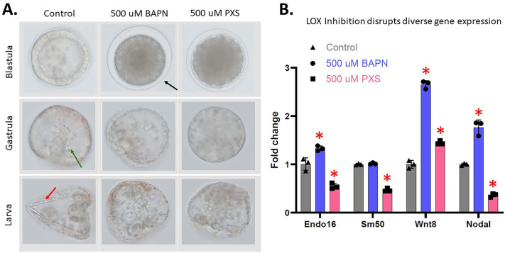 Fig. 4. Inhibition of LOX activity affects embryonic development in the sea urchin. (A) Phenotypic observation of LOX-inhibited embryos through BAPN and PXS. 500 µM BAPN and 500 µM PXS showed a similar phenotypic effect, resulting in a developmental delay in the blastula stage marked by the fertilization envelope, shown with a black arrow. In gastrulation, the gut invaginates (green arrow) in control embryos, while LOX inhibited embryos show a lack of the gut formation. The control larval stages form a prism shape with skeletal rods (shown with a red arrow), and LOX-inhibited embryos lack a triangular phenotype and skeletal rod formation. B) RNA accumulation by qPCR of cell type markers important in development. These embryos were dosed at blastula stage and allowed to absorb the inhibitor for 24 h before being collected and analyzed at gastrula stage. BAPN and PXS were used at 500 µM. t-tests were used for statistical analysis (*P<0.05). The y-axis of the graph represents the fold change in RNA expression in the LOX-inhibited embryos compared to a control normalized to 1 at the same time point in development. Embryos are approximatively 100 μm in diameter.