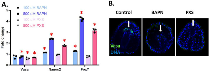 Fig. 5. Effect of LOX inhibition on germline-related genes in gastrulae. (A) RNA accumulation by qPCR data shows a significant decrease in Vasa expression in embryos treated with 100 µM PXS and BAPN/PXS at 500 µM compared to controls. Nanos2 is upregulated at 500 µM of both BAPN and PXS. FoxY expression significantly increased at high doses of BAPN/PXS by a fold change of over 3. *P<0.05. The y-axis of the graph represents the fold change in RNA expression in the LOX-inhibited embryos compared to a control normalized to 1 at the same time point in development. (B) Vasa protein (green) is undetectable after 500 µM of BAPN or PXS treatment (arrows). DNA is labeled in blue. Embryos are approximatively 100 μm in diameter.