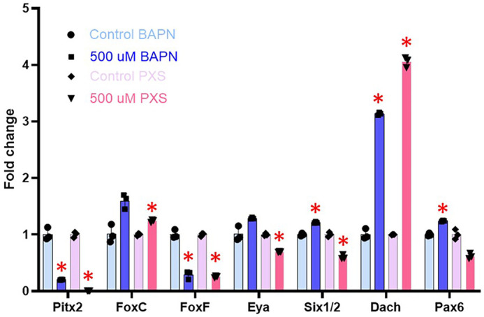 Fig. 6. Effect of BAPN and PXS on coelomic pouch genes. RNA accumulation of coelomic pouch genes analyzed by qPCR at gastrula stage. Embryos were treated with drugs from blastula to gastrula stage. *P<0.001. The y-axis of the graph represents the fold change in RNA expression in the LOX-inhibited embryos compared to a control normalized to 1 at the same time point in development. BAPN and PXS were used at 500 µM.
