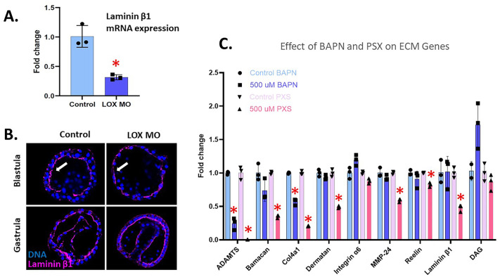 Fig. 8. Effect of LOX inhibition on other ECM genes. (A) Laminin-beta-1 expression in LOXL(X1/X2) MO gastrula-stage embryos through qPCR analysis. The expression of laminin-beta-1 significantly (P<0.05) decreased in embryos injected with LOXL(X1/X2) MO compared to the control. (B) Immunofluorescence of laminin-beta-1 (pink) and DNA (blue) show a slight decrease in expression in the LOXL(X1/X2) MO embryos complementary to the qPCR data. (C) RNA accumulation by qPCR analysis of ECM-associated genes in 500 µM BAPN- or PXS-treated embryos at gastrula stage. Embryos were treated with drugs from blastula to gastrula stage. ADAMTS and Collagen4a1 are significantly downregulated in both BAPN- and PXS-treated embryos. *P<0.001. The y-axis of the graph represents the fold change in RNA expression in the LOX-inhibited embryos compared to a control normalized to 1 at the same time point in development. Embryos are approximatively 100 μm in diameter.