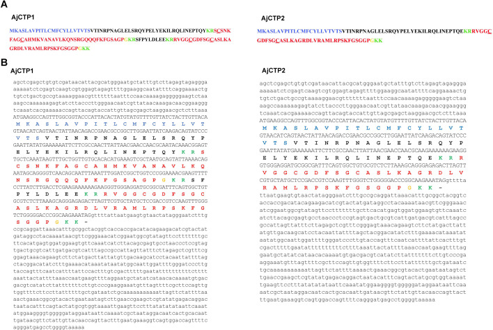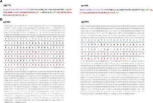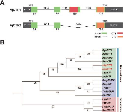 Figure 1—figure supplement 1. Calcitonin-type (CT-type) neuropeptide precursors in A. japonicus.(A) AjCTP1 comprises two putative CT-type neuropeptides, AjCT1 and AjCT2, whereas AjCTP1 generated by alternative splicing comprises only AjCT2. The predicted signal peptide is shown in blue, the predicted cleavage sites (KR or KK) are shown in green, CT-type neuropeptides are shown in red and C-terminal glycines that are potential substrates for amidation are shown in orange. Predicted disulfide bridges in AjCT1 and AjCT2 are formed between the two underlined cysteines. (B) Nucleotide sequences encoding CT-type neuropeptide precursors and the deduced amino acid sequences in A. japonicus. 3’UTR and 5’UTR are shown in lowercase and the ORF is shown in uppercase. Blue uppercase labels the predicted signal peptide, the green uppercase shows the predicted cleavage site, AjCT1 and AjCT2 are shown in red and the putative substrate for amidation is shown in orange. |
