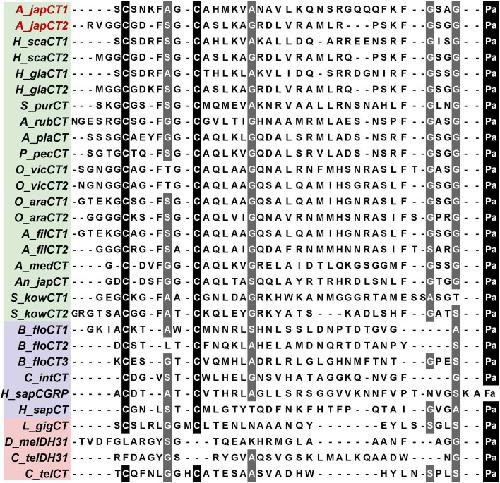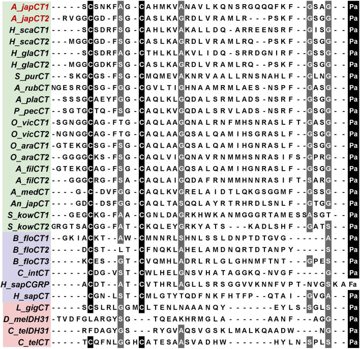 Figure 1—figure supplement 2. Comparison of the sequences CT-type neuropeptides from Bilateria: deuterostomes-ambulacraria (green), deuterostomes-chordates (purple), and protostomes (pink).The conserved residues are shown with white lettering highlighted in gray and black. The accession numbers or citations are shown in Figure 1—source data 1. |