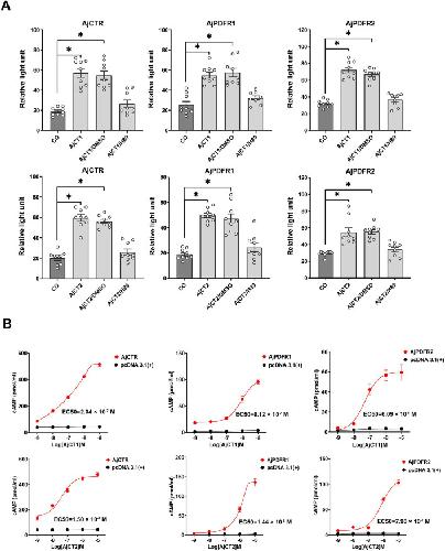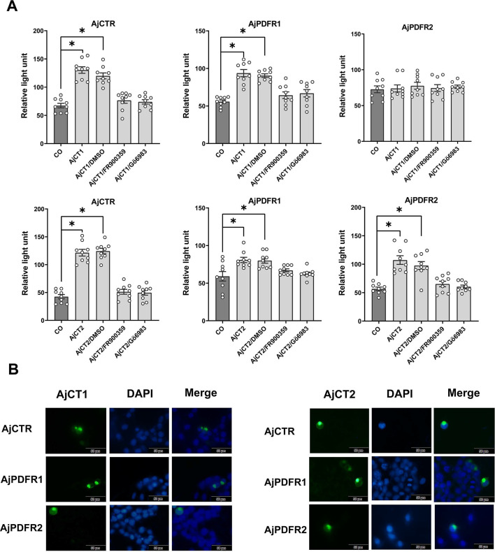 Figure 4. SRE-driven luciferase activity and receptor internalization in cells transfected with AjCTR, AjPDFR1, or AjPDFR2 and exposed to AjCT1 or AjCT2.(A) SRE-driven luciferase activity measured after incubation with neuropeptide (10–6 M AjCT1 or AjCT2)/DMSO, neuropeptide (10–6 M)/FR900359 (1 μM) and neuropeptide (10–6 M)/Gö 6983 (1 μM). Mean values with standard deviations (n=9) are shown. * indicates a statistically significant difference with p<0.05. (B) Internalization of AjCTR, AjPDFR1, and AjPDFR2 after 15 min treatment with 10–6 M AjCT1 or AjCT2. Green fluorescence represents the localization of pEGFP-N1/receptors in cells. The cell nucleus probe (DAPI) was used for cell nucleus staining. Scale bar: 50 µm. All pictures are representative of three independent experiments.
