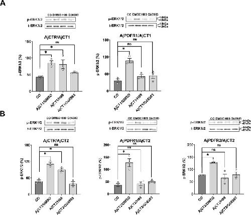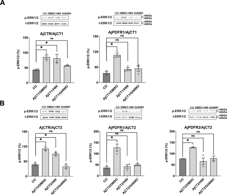 Figure 5—figure supplement 1. Effects of PKA or PKC inhibitor on AjCT1 or AjCT2 stimulated ERK1/2 phosphorylation in AjCTR, AjPDFR1, or AjPDFR2 expressing HEK293T cells.(A) ERK1/2 phosphorylation, activated by AjCT1, is blocked by PKC inhibitor Gö 6983 in AjCTR expressing HEK293T cells and is blocked by PKA inhibitor H89 and PKC inhibitor in AjPDFR1 expressing HEK293T cells. (B) ERK1/2 phosphorylation, activated by AjCT2, is blocked by PKC inhibitor in AjCTR expressing HEK293T cells and is blocked by PKA inhibitor and PKC inhibitor in AjPDFR1 and AjPDFR2 expressing HEK293T cells. Serum-starved HEK293 cells were pre-treated with DMSO, PKA inhibitor, or PKC inhibitor before AjCT1 or AjCT2 stimulation. All images are representative of three independent experiments. Error bars represent SEM for three independent experiments. Statistically significant differences are indicated as follows: *: p<0.05, ns: no significant.