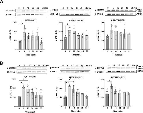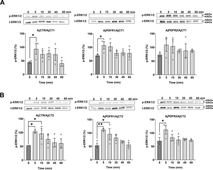 Figure 5. ERK1/2 activity in cells transfected with AjCTR, AjPDFR1, or AjPDFR2 and exposed to AjCT1 or AjCT2.(A) and (B) show the immunoblot intensity of representative phosphorylation bands. The transfected HEK293T cells were incubated with AjCT1 (10–6 M) or AjCT2 (10–6 M) for 0, 5, 15, 30, 45, and 60 min. The p-ERK1/2 was normalized based on t-ERK1/2. All images are representative of three independent experiments. Error bars represent SEM for three independent experiments. Statistically significant differences are indicated as follows: *: p<0.05, **: p<0.01.