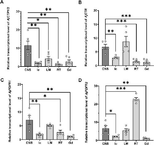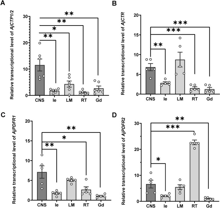 Figure 6. The relative expression level of AjCTP1/2 (A), AjCTR (B), AjPDFR1 (C), and AjPDFR2 (D) in different tissues.The circumoral nervous system was selected as the control group. Values are means ± SEM (AjCTP1/2, n=6; AjCTR, AjPDFR1, and AjPDFR2, n=5). Asterisks represent significant differences as follows: *: p<0.05, **: p<0.01, ***: p<0.001. CNS, circumoral nervous system; Gd, gonad; Ie, intestine; LM, longitudinal muscle; RT, respiratory tree.