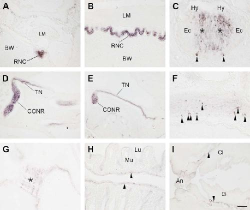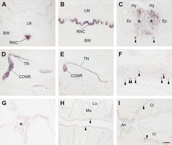 Figure 7. Immunohistochemical localization of CT-type neuropeptide expression in A. japonicus using antibodies to the starfish CT-type neuropeptide ArCT.(A) Transverse section showing immunostaining in the radial nerve cord. (B) Longitudinal section showing immunostaining in the radial nerve cord. (C) High-magnification image of a transverse section showing immunostained cells (arrowheads) and immunostained fibers in the neuropile (asterisks) of the ectoneural region of the radial nerve cord. Note the absence of immunostaining in the hyponeural region. (D, E) Longitudinal sections showing immunostaining in the circumoral nerve ring and in tentacle nerves that emanate from the circumoral nerve ring. (F) High-magnification image of a transverse section showing immunostained cells (arrowheads) in the circumoral nerve ring. (G) Longitudinal section showing immunostained fibers (asterisk) at the junction between the pharynx and the stomach. (H) Longitudinal section showing immunostained fibers (arrowheads) in the intestine. (I) Longitudinal section showing immunostained fibers (arrowheads) in the cloaca. Abbreviations: An, anus; BW, body wall; Cl, cloaca; CONR, circumoral nerve ring; Ec, Ectoneural region of the radial nerve cord; Hy, hyponeural region of the radial nerve cord; LM, longitudinal muscle; Lu, lumen; Mu, mucosa; RNC, radial nerve cord; TN, tentacle nerve. Scale bar, as shown in panel I, is 100 µm in A, B, D, E, I; 50 µm in F, G, H; 25 µm in C.