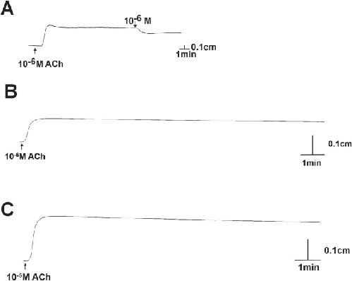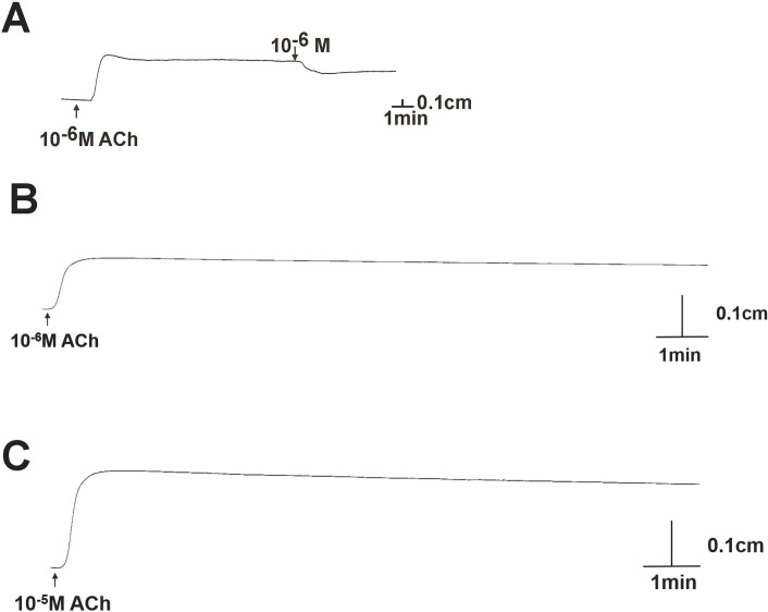 Figure 8—figure supplement 1. Positive control on experimental tissues and pharmacological effects of 10–6 M AjCT2 on longitudinal muscle from A. japonicus.(A) shows a recording of the relaxing effect of AjCT2 (10–6 M) on a longitudinal muscle preparation. (B) and (C) respectively are recordings of the contracting effects of ACh on longitudinal muscle and intestine preparations, showing that the effect of ACh persists for at least 15 min. All recordings shown are representative of three independent experiments.