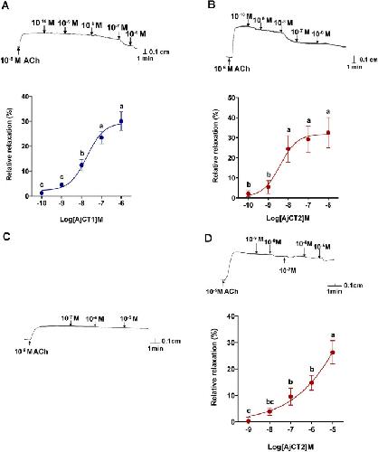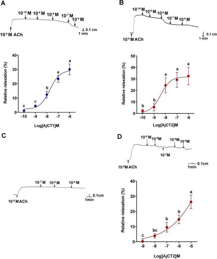 Figure 8. Pharmacological effects of AjCT1 and AjCT2 on longitudinal muscle and intestine preparations from A. japonicus.(A) and (B) show representative recordings of the relaxing effects of AjCT1 and AjCT2 on longitudinal muscle preparations. The graphs show the dose-dependent relaxing effects of AjCT1 and AjCT2 (10–10 – 10–6 M), calculated as the percentage reversal of the contracting effect of 10–6 M ACh. (C) and (D) show representative recordings of experiments in which AjCT1 (10–7 – 10–5 M) and AjCT2 (10–9 – 10–5 M) were tested on intestine preparations. AjCT1 had no effect, but AjCT2 caused relaxation, and the graph shows the dose-dependent relaxing effect of AjCT2 (10–9 – 10–5 M), calculated as the percentage reversal of the contracting effect of 10–5 M ACh. All recordings shown are representative of three independent experiments. Mean values ± SEM were determined from three preparations. Lowercase letters a, b, and c above columns indicate the statistical difference at p<0.05, whilst there is no significant difference between bc and c.