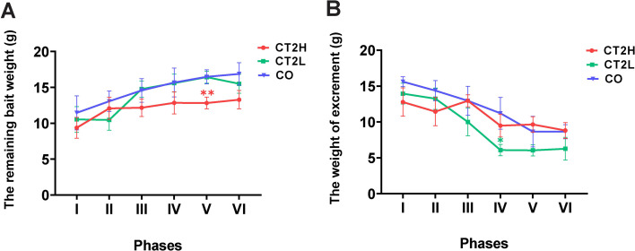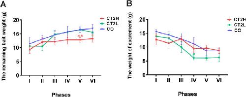 Figure 9—figure supplement 1. Measurement of the mass of remaining bait and excrement for AjCT2-treated and control animals.(A) Remaining bait mass in different phases. (B) The mass of excrement in different phases. The 24-day experiment was divided into six phases (I–VI), with each phase comprising 4 days for statistical analysis. CO: control group (sterilized seawater); CT2L: AjCT2 low concentration group (5 × 10–3 mg/mL); CT2H: AjCT2 high concentration group (5 × 10–1 mg/mL). Values are means ± SEM (n=3, representing three parallel experiments of each group). Asterisks represent the significant difference as follows: *: p<0.05, **: p<0.01.