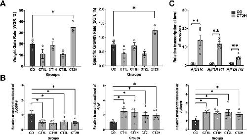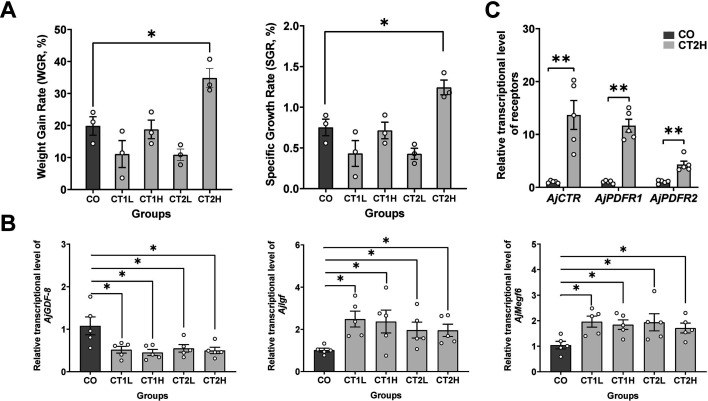 Figure 9. In vivo pharmacological tests revealed that AjCT1 and AjCT2 affect feeding and growth-related gene expression in A. japonicus.(A) Weight gain rate (WGR) and specific growth rate (SGR) in experimental and control groups. Values are means ± SEM (n=3, representing three parallel experiments of each group). (B) The relative intestinal transcript expression levels of AjGDF-8, AjIgf, and AjMegf6 in different groups after injection of AjCT1 or AjCT2 or sterilized seawater (CO) in A. japonicus. Values are means ± SEM (n=5 biological duplication). (C) The relative intestinal expression levels of AjCT1/2 receptors (AjCTR, AjPDFR1, and AjPDFR2) in CT2H and CO groups after 24 days injection experiment. Values are means ± SEM (n=5 biological duplication). CO: control group (sterilized seawater); CT1L/CT2L: AjCT1/AjCT2 low concentration group (5×10–3 mg/mL); CT1H/CT2H: AjCT1/AjCT2 high concentration group (5×10–1 mg/mL). * indicates statistically significant differences with p<0.05, ** indicates statistically significant differences with p<0.01.