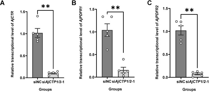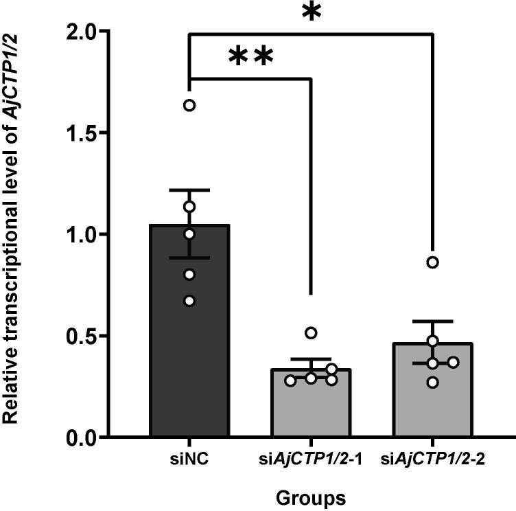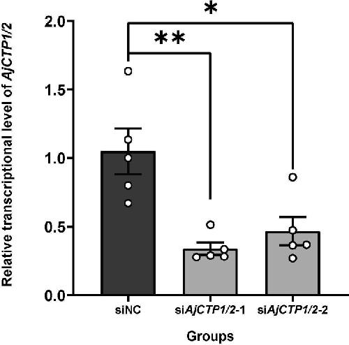 Figure 10—figure supplement 1. The relative expression level of AjCTP1/2 in siNC, siAjCTP1/2-1, and siAjCTP1/2-2.siNC: negative control group; siAjCTP1/2-1 and siAjCTP1/2-2: experimental groups targeting AjCTP1/2. Values are means ± SEM (n=5). Asterisks represent the significant differences as follows: *: p<0.05, **: p<0.01.