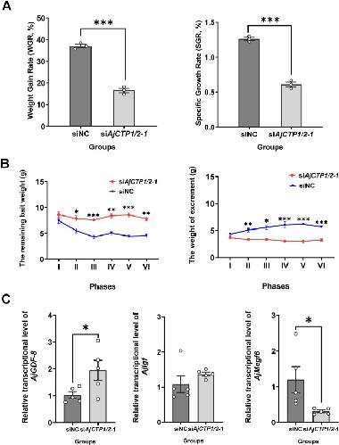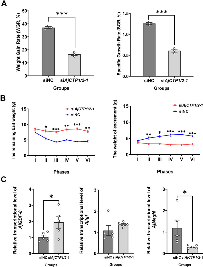 Figure 11. Effects of 24-day AjCTP1/2-1 knockdown in vivo on feeding and growth in A. japonicus.(A) Weight gain rate (WGR) and specific growth rate (SGR) in siNC and siAjCTP1/2-1 groups. Values are means ± SEM (n=3, representing three parallel experiments for each group). (B) Calculation of the remaining bait and excrement mass in different phases. The 24-day experiment was divided into six phases (I–VI), with each phase comprising 4 days. Values are means ± SEM (n=3, representing three parallel experiments for each group). (C) The relative intestinal transcript expression levels of AjGDF-8, AjIgf, and AjMegf6 in siNC and siAjCTP1/2-1 groups. Values are means ± SEM (n=5 biological duplication). siNC: negative control group; siAjCTP1/2-1: effectively experimental groups targeting AjCTP1/2. Asterisks represent statistically significant differences as follows: *: p<0.05, **: p<0.01, ***: p<0.001.