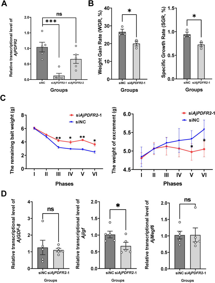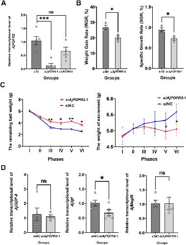 Figure 12. Effects of AjPDFR2-1 knockdown in vivo on feeding and growth in A. japonicus.(A) The relative expression level of AjPDFR2 in siNC, siAjPDFR2-1, and siAjPDFR2-2. (B) Weight gain rate (WGR) and specific growth rate (SGR) in siNC and siAjPDFR2-1 groups. Values are means ± SEM (n=3, representing three parallel experiments for each group). (C) The remaining bait and excrement weight in different phases. The 24-day experiment was divided into six phases (I–VI), with each phase comprising 4 days. Values are means ± SEM (n=3, representing three parallel experiments of each group). (D) The relative intestinal transcript expression levels of AjGDF-8, AjIgf, and AjMegf6 in siNC and siAjPDFR2-1 groups. Values are means ± SEM (n=5 biological duplication). siNC: negative control group; siAjPDFR2-1 and siAjPDFR2-2: experimental groups targeting AjPDFR2. Asterisks represent statistically significant differences as follows: *: p<0.05, **: p<0.01, ***: p<0.001. ns: not significant.