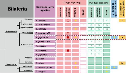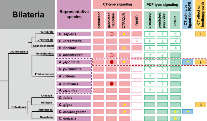 Figure 13. Phylogenetic summary of the occurrence and properties of CT-type and PDF-type signaling systems and effects of CT-type peptides on feeding/growth regulation in representative species.Echinoderms are boxed in purple with dashed lines, and A. japonicus, the focus of this study, is framed in red with dashed lines. Pink filled rectangles indicate the occurrence of CT-type precursors/neuropeptides, CTR/CLR-type receptors, and RAMPs. Green filled rectangles indicate the occurrence of PDF-type precursors/neuropeptides and receptors. Blue filled rectangles indicate species in which CT-type peptides have been shown to act as ligands for PDF-type receptors. Yellow filled rectangles indicate species in which effects or lack of effects of CT-type peptides on feeding/growth have been reported (I: Inhibition; P: Promotion; N: No effect). Red circles indicate that neuropeptides are generated by alternative splicing of precursor transcripts, with an unfilled circle indicating that transcripts encode one neuropeptide and with a filled circle indicating that transcripts can encode two neuropeptides in tandem. A yellow asterisk marks species in which neuropeptides have been shown to act as ligands for receptors experimentally. Unfilled rectangles indicate the absence of a protein. Unfilled rectangles containing a cross (X) indicate loss of a protein during evolution. Unfilled rectangles containing a question mark (?) indicate the existence of precursors/peptides that have yet to be identified. |
