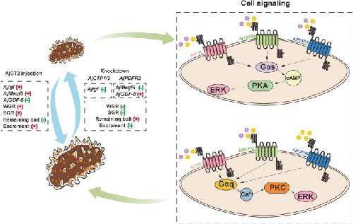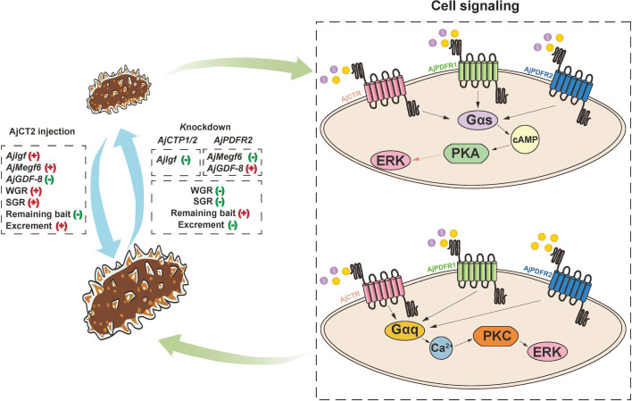 Figure 14. A schematic showing proposed molecular mechanisms by which CT-type signaling regulates feeding and growth in A. japonicus.AjCT1 and AjCT2 are represented by purple and yellow circles, respectively. For cell signaling, black arrows indicate that this process is activated, while the pink arrow indicates that ERK1/2 is activated in the AjCT1/AjPDFR1, AjCT2/AjPDFR1, and AjCT2/AjPDFR2 signaling pathways. |