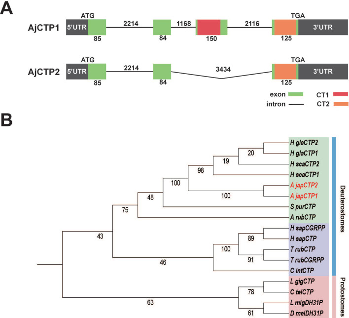 Figure 1. CT-type neuropeptide precursors and candidate receptors for CT-type peptides in A. japonicus.(A) Alternative splicing schematic of AjCTP1 and AjCTP2. Exons are represented by green rectangles, introns are represented by lines, AjCT1 and AjCT2 are represented by red and orange rectangles respectively, upstream and downstream non-coding regions are represented by gray rectangles. The numbers represent the length of exons or introns. (B) Phylogenetic analysis of AjCTP1 and AjCTP2 and CT-related neuropeptide precursors from other bilaterians. CT-type precursors from deuterostomes are shown in green (echinoderms) and purple (chordates), CT-type precursors from protostomes are shown in pink. Full species names and accession numbers are listed in Figure 1—source data 1.