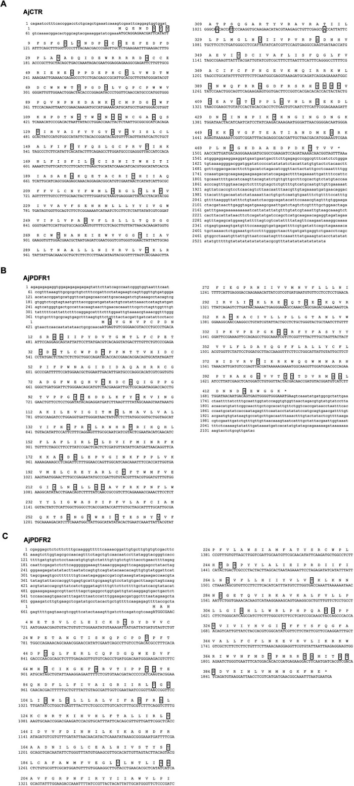 Figure 2—figure supplement 1. Amino acid sequences and phosphorylation sites of AjCTR, AjPDFR1, and AjPDFR2 in A. japonicus.(A), (B), and (C) show the cDNA sequences encoding the receptors and their deduced amino acid sequences. ORFs are shown in uppercase; 3’UTR and 5’UTR are shown in lowercase. The stop codon is shown by the asterisk (*). Predicted potential phosphorylation sites are shown with squares. |