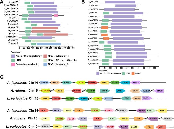 Figure 2—figure supplement 2. Characterization of AjCT1 and AjCT2 receptors (AjCTR, AjPDFR1, and AjPDFR2).(A) Conserved domains of CTR/CLR-type protein sequences. Black line represents the length of proteins and different domains are represented by rectangles. (B) Conserved domains of PDFRs in Bilateria. Black line represents the length of proteins and different domains are represented by rectangles. (C) Synteny analysis of AjCT1 and AjCT2 receptors (AjCTR, AjPDFR1, and AjPDFR2). The chromosomal locations of AjCT1 and AjCT2 receptor genes from A. rubens, L. variegatus, and A. japonicus are shown, with different colors used to mark neighboring genes and with their transcriptional direction shown by arrows. GOLGA4, golgin subfamily A member 4; NeuroD, neurogenic differentiation factor; CRF2, corticotropin-releasing factor receptor 2; CTR, calcitonin type receptor; CLR, calcitonin gene-related peptide type 1 receptor; ppGalNAc-T, polypeptide N-acetylgalactosaminyltransferase; URB3, E3 ubiquitin-protein ligase ubr3; SLC40A1, solute carrier family 40 member 1; CMAH, cytidine monophosphate-N-acetylneuraminic acid hydroxylase; MAGP, microfibril-associated glycoprotein; HCN, hyperpolarization-gated and cyclic nucleotide-regulated channel; ATG9A, autophagy-related protein 9A-like; lysRS, lysine--tRNA ligase; FCN, ficolin; PDFR1, pigment-dispersing factor receptor 1; PDFR2, pigment-dispersing factor receptor 2; PSMD8, 26 S proteasome regulatory subunit 8; SARNP, SAP domain-containing ribonucleoprotein; HPM1, histidine protein methyltransferase 1; PNPO, pyridoxine-5'-phosphate oxidase.