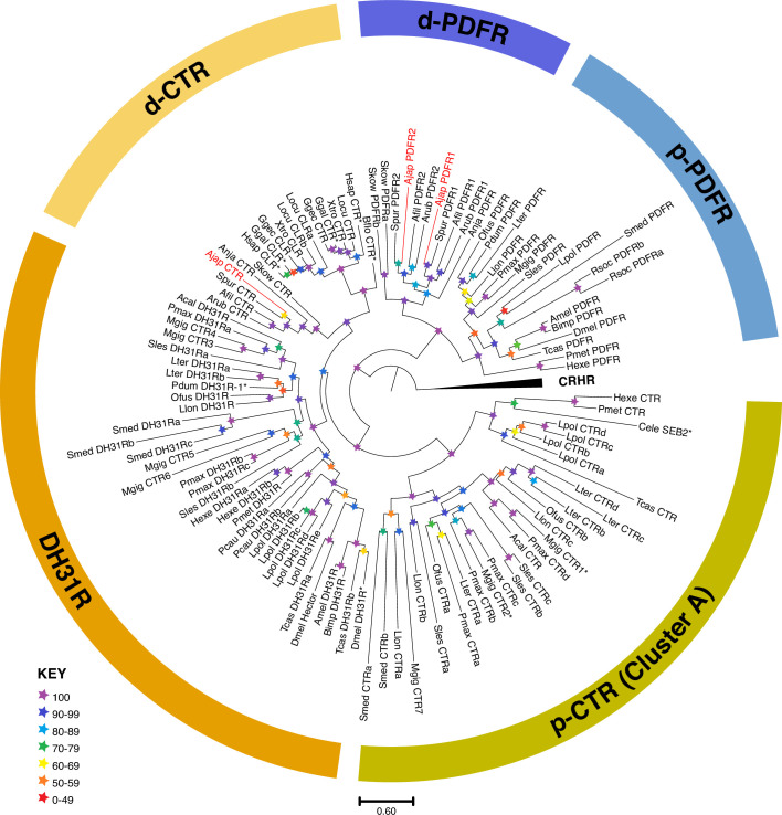 Figure 2. Maximum-likelihood phylogenetic tree of bilaterian CT-type and PDF-type receptor families, including those found in A. japonicus, rooted with CRH-type receptors.The tree comprises distinct CT-type receptor and PDF-type receptor clades with bootstrap support >90. The CT-type receptor clade is subdivided into a deuterostome-specific clade (dCTR, yellow), which includes the A. japonicus CTR (AjCTR), and two protostome receptor clades. One comprises DH31 receptors (DH31R, orange), and the other comprises protostome-specific CTRs (p-CTR [Cluster A], green). The name ‘Cluster A’ is referenced for consistency with Cardoso et al., 2024. The PDF-type receptors are subdivided into protostome (p-PDFR, blue) and deuterostome (d-PDFR, purple) clades, with the latter including the two A. japonicus PDFRs (AjPDFR1, AjPDFR2). The stars represent branch support (bootstrap 1000 replicates, see key). The scale bar indicates amino acid substitutions per site. The A. japonicus receptors characterized in this paper are highlighted in red, and CT-type family receptors for which ligands have been identified experimentally in other published studies are indicated with an asterisk (Gorn et al., 1992; McLatchie et al., 1998; Johnson et al., 2005; Bauknecht and Jékely, 2015; Sekiguchi et al., 2016; Schwartz et al., 2019; Beets et al., 2023; Huang et al., 2024). Species names are abbreviated as follows: Acal (Aplysia californica), Afil (Amphiura filiformis), Ajap (Apostichopus japonicus), Amel (Apis mellifera), Anja (Anneissia japonica), Arub (Asterias rubens), Bflo (Branchiostoma floridae), Bimp (Bombus impatiens), Cele (Caenorhabditis elegans), Cint (Ciona intestinalis), Dmel (Drosophila melanogaster), Ggal (Gallus gallus), Ggec (Gekko gecko), Hexe (Hypsibius exemplaris), Hsap (Homo sapiens), Llon (Lineus longissimus), Locu (Lepisosteus oculatus), Lpol (Limulus polyphemus), Lter (Lumbricus terrestris), Mgig (Magallana gigas), Ofus (Owenia fusiformis), Pcau (Priapulus caudatus), Pdum (Platynereis dumerilii), Pmax (Pecten maximus), Pmet (Paramacrobiotus metropolita), Rsoc (Rotaria socialis), Scla (Styela clava), Skow (Saccoglossus kowalevskii), Sles (Sepioteuthis laessoniana), Smed (Schmidtea mediterranea), Spur (Strongylocentrotrus purpuratus), Tcas (Tribolium castaneum), Xtro (Xenopus tropicalis). Sequence accession numbers are listed in Figure 2—source data 1.