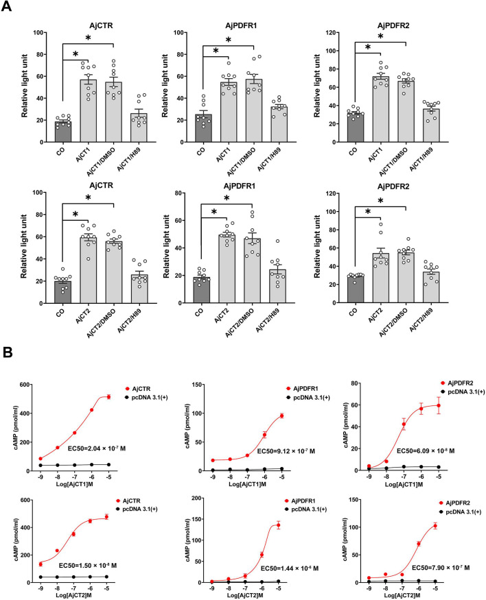Figure 3. Pharmacological characterization of AjCT1 and AjCT2 as ligands for the A. japonicus receptors AjCTR, AjPDFR1, and AjPDFR2.(A) CRE-driven luciferase activity measured in HEK293T cells transfected with one of the three candidate receptors after exposure to AjCT1 or AjCT2 or neuropeptide +DMSO or neuropeptide +H89 (10 μM) or serum-free DMEM (CO, negative control). The neuropeptide concentration used here was 10–6 M. Mean values with standard deviations (n=9) are shown. * indicates a statistically significant difference with p<0.05. (B) Measurement of cAMP accumulation after exposure to AjCT1 or AjCT2 (10–9 – 10–5 M). No cAMP elevation is observed in control experiments where HEK293T cells were transfected with empty pcDNA 3.1(+) (black circle). The estimated EC50 of AjCT1 for AjCTR, AjPDFR1, and AjPDFR2 was 2.04×10–7 M (95% CI: 1.06×10–7 –8.69×10–7 M), 9.12×10–7 M (95% CI: 5.56×10–7 –4.45×10–6 M), and 6.09×10–8 M (95% CI: 2.23×10–8 –2.84×10–7 M), respectively. The estimated EC50 of AjCT2 for AjCTR, AjPDFR1, and AjPDFR2 was 1.50×10–8 M (95% CI: 1.03×10–9 –3.89×10–8 M), 1.44×10–6 M (95% CI: 1.04×10–6 –1.99×10–6 M), and 7.90×10–7 M (95% CI: 5.73×10–7 –1.06×10–6 M), respectively. Error bars represent SEM for three independent experiments.