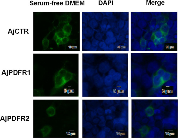 Figure 4—figure supplement 1. Negative control for analysis of AjCTR, AjPDFR1, and AjPDFR2 internalization.The images show the localization of AjCTR, AjPDFR1, and AjPDFR2 in HEK293T cells without AjCT1 or AjCT2 stimulation. Green fluorescence represents the localization of pEGFP-N1/receptors in cell membrane. Cell nucleus probe (DAPI) was applied for cell nucleus staining. All pictures are representative of three independent experiments.