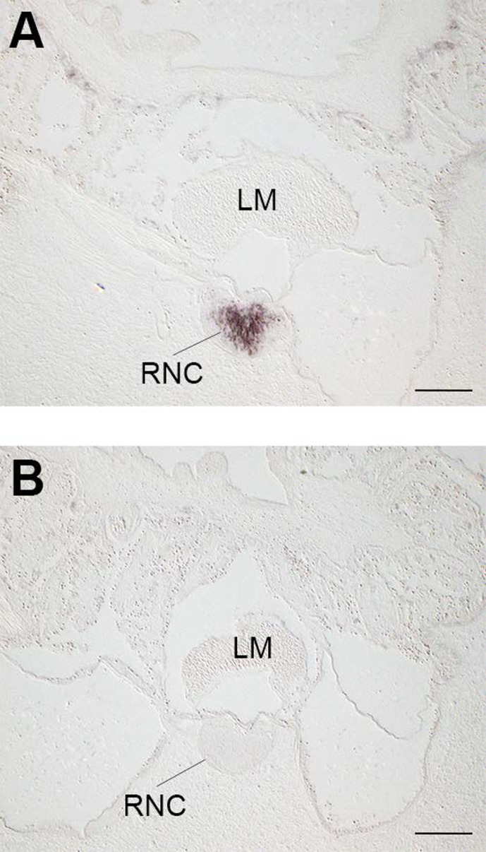 Figure 7—figure supplement 1. Immunostaining in the radial nerve cord of A. japonicus is abolished by pre-absorption of ArCT antiserum with the ArCT antigen peptide.(A) Transverse section of a juvenile specimen of A. japonicus showing immunostaining in the radial nerve cord revealed by an antiserum to the starfish calcitonin-type neuropeptide ArCT, as also shown in Figure 7A. (B) A transverse section neighboring the section shown in A was incubated with ArCT antiserum that had been pre-absorbed with the ArCT antigen peptide; note the absence of immunostaining in the radial nerve cord, demonstrating the specificity of the immunostaining in A. Abbreviations: LM, longitudinal muscle; RNC, radial nerve cord. Scale is 100 µm.