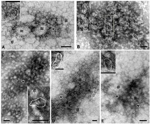 Figure 3. Representative images of complexes obtained by ultracentrifugation from different holothurian organs. (A)—coelomic fluid: #—spherical particles 20–30 nm; ≈—oval particles, up to 200 nm; *—an accumulation of small elements not organized into distinct structures. (B)—gut: stacks of “sticks” are shown in frames; *—accumulation of elements. (C)—respiratory trees: #—spherical particles; *—fine-grained material. (D)—gonads: #—spherical particles; *—accumulation of elements. (E)—body wall: #—spherical particles; *—fine-grained material. In all images, contours show stacks of “sticks”. Transmission electron microscopy, negative contrast. Length of scale bars corresponds to 50 nm.
