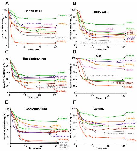 Figure 4. DLS data on typical examples of changes in the relative stability of the complexes (0.005–0.01 mg/mL) from the whole body (A), body wall (B), respiratory trees (C), gut (D), coelomic fluid (E), and gonads (F) in different conditions.
