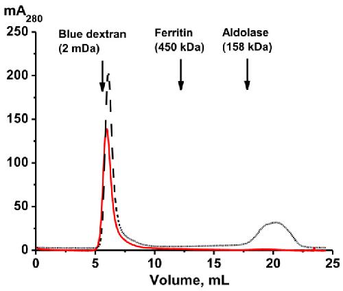 Figure 5. Gel filtration on Sepharose 4B of the whole-body complex before (red line) and after (black line) its treatment under severe conditions (8.0 M urea containing 1.0 M NaCl).