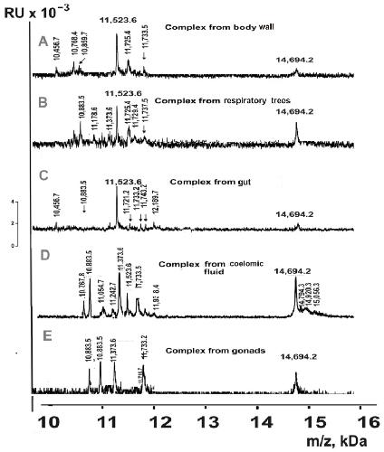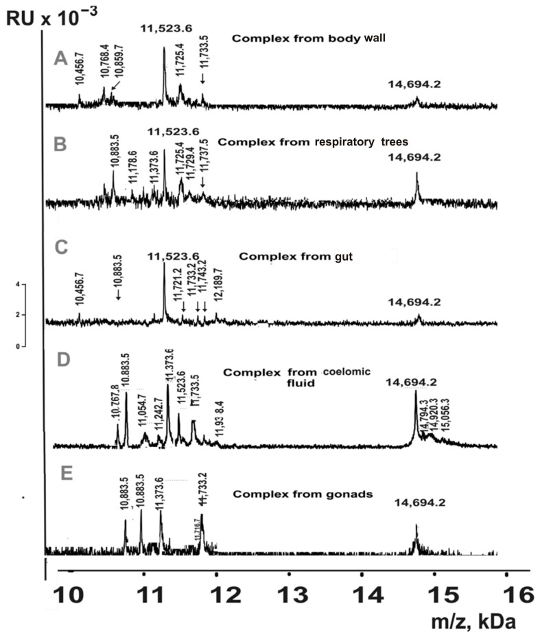 Figure 7. MALDI spectra of 10–20 kDa proteins eluted from Tips C18 by acetonitrile for complexes from different organs of sea cucumbers: body wall ((A); 20% acetonitrile), respiratory trees (B); 40%), gut (C); 70%), coelomic fluid (D); 30%), and gonads (E); 50%).