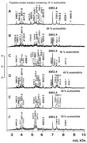 Figure 8. MALDI spectra of oligopeptides 2.5–10 kDa eluted from Tips C18 by different concentrations of acetonitrile for complexes from coelomic fluid (A–F).