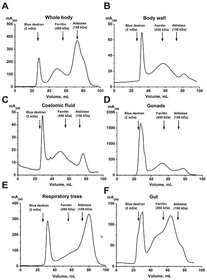 Figure 1. Isolation of protein complexes from the sea cucumber P. chilensis by FPLC gel filtration on a Sepharose 4B column using homogenates of intact sea cucumbers (A) and their different organs and tissues: body wall (B), coelomic fluid (C), gonads (D), respiratory trees (E), and gut (F).